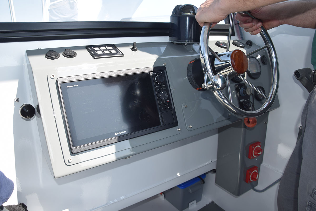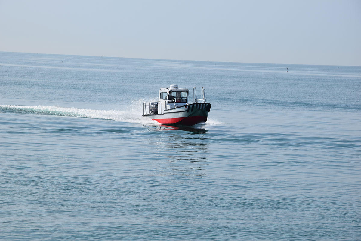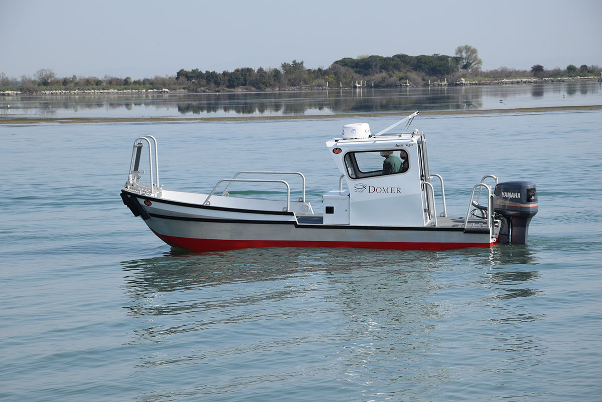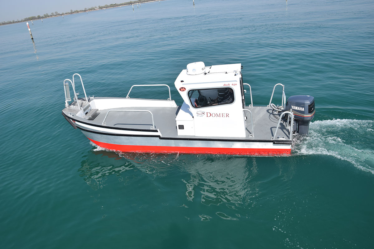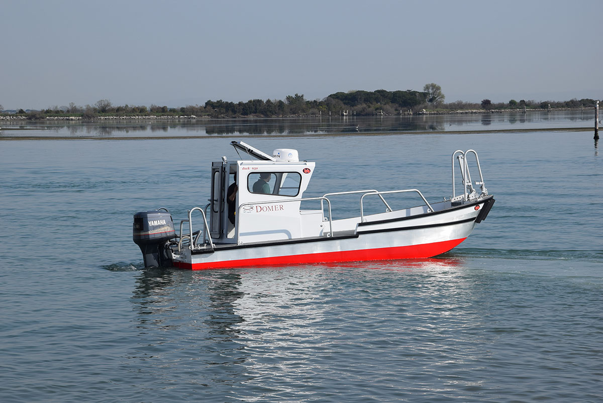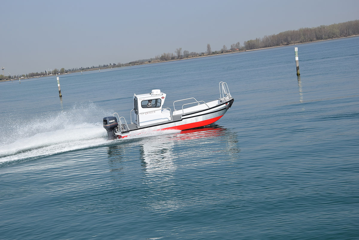 Imbarcazione realizzata in lega di alluminio/magnesio per uso professionale adatta al trasporto di merci e persone.